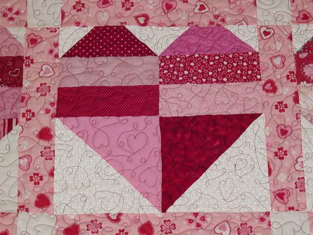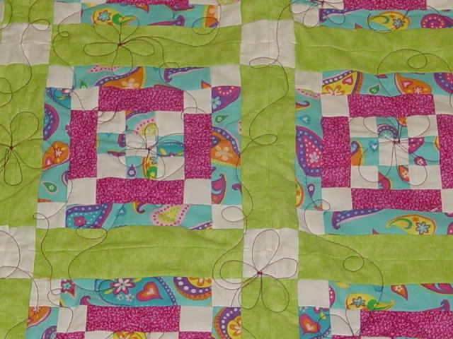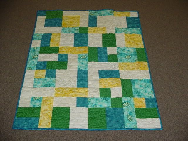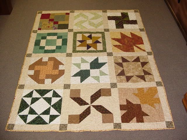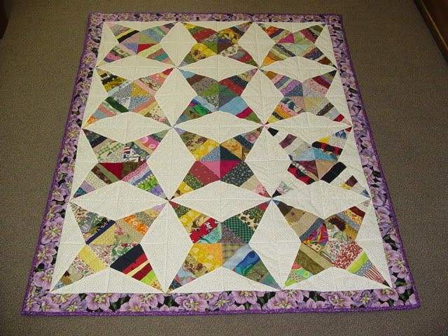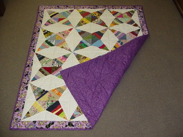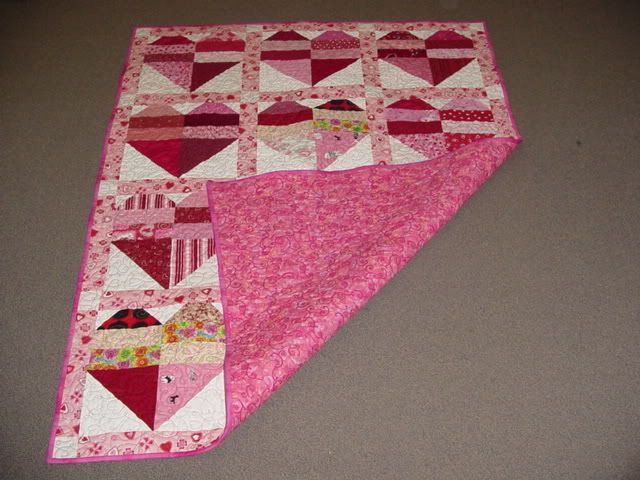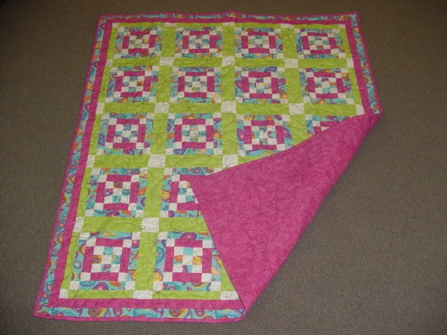 These were swap blocks from a swap back in February of this year. I pieced the top together back in August I believe and just finished the binding on it this morning. I machine quilted it with variagated thread in a loopy heart pattern. I just love the backing fabric! Might have a hard time parting with this one.